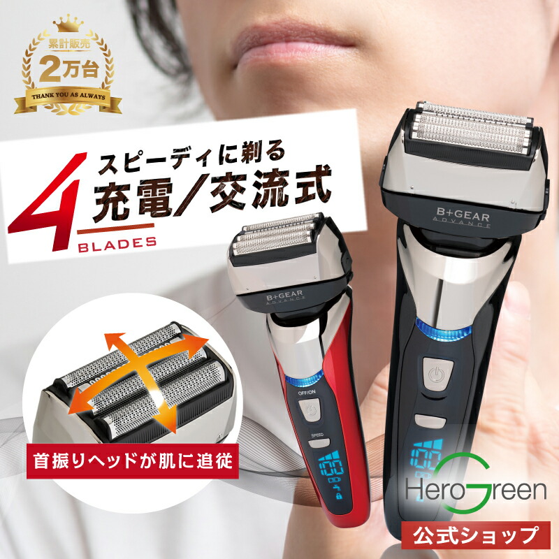 【楽天市場】\首振りヘッドで深剃り/シェーバー 4枚刃 往復式 メンズ 髭剃り 電気シェーバー 電動シェーバー ひげそり 男性 電動 電気カミソリ きわ剃り ヒゲ モミアゲ コードレス 急速 充電 交流 水洗い 出張 海外 携帯 売れ筋 1年保証 ヒーローグリーン B+GEAR ビーギア HG-590:HGウェルセレクション